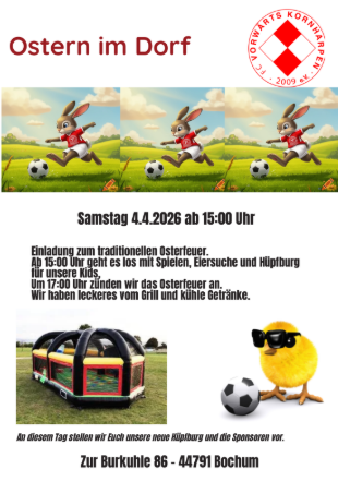 Am Samstag 4.4.2026 findet unser traditionelles Osterfest mit Kinderspielen, Ostereiersuche und Osterfeuer statt. In diesem Jahr könnt Ihr unsere neue Hüpfburg bestaunen. es gibt leckeres vom Grill und kühle Getränke.